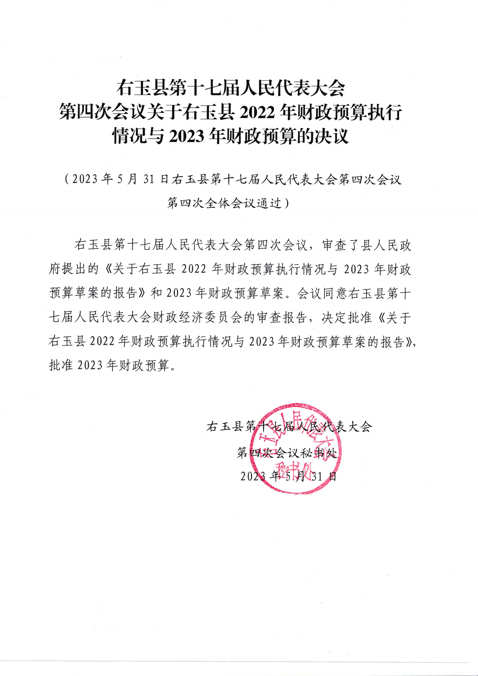 右玉縣第十七屆人民代表大會(huì)第四次會(huì)議關(guān)于右玉縣2022年財(cái)政預(yù)算執(zhí)行情況與2023年財(cái)政預(yù)算的決議