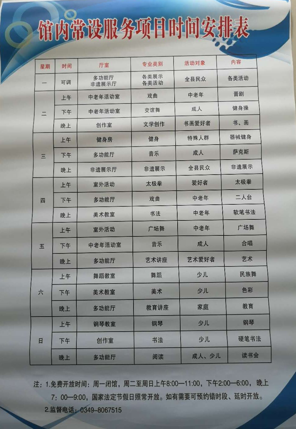 右玉縣文化館免費(fèi)開放及館內(nèi)常設(shè)服務(wù)項(xiàng)目